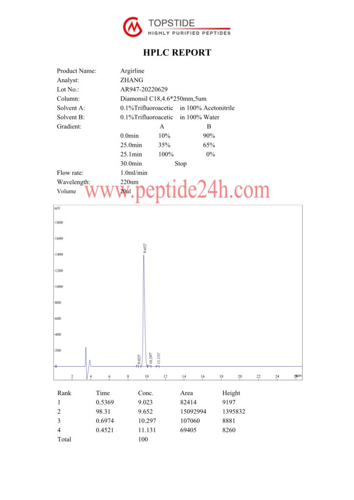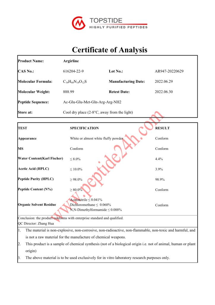 Argireline is called botulax-like, and it is a small molecule composed of six amino acids.Argireline is the synthetic peptide consisting of arginine, methionine, glutamine, and glutamic acid hexapeptide with acetic acid.Argireline has the effect of botulax, but it does not have the side effects of Botulax.