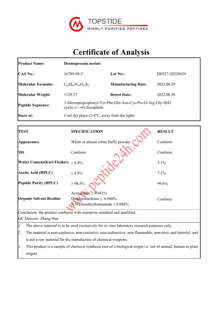 Desmopressin acetate (DDAVP), which is the deamination of 1-cysteine and the replacement of 8-L-arginine with 8-D-arginine, also known as aminoarginine vasopressin, is a natural Structural analog of arginine vasopressin, a derivative of vasopressin, its antidiuretic effect is more powerful and durable than that of vasopressin, but it has no vasoconstriction effect and has few drug side effects. It is clinically used for congenital Or drug-induced platelet dysfunction, uremia, liver cirrhosis and unexplained bleeding time prolongation; can be used to control and prevent bleeding during minor surgery; central diabetes insipidus, etc.