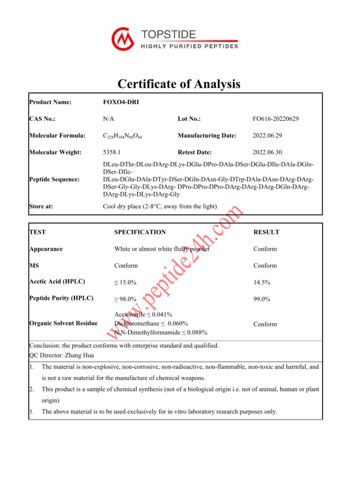 FOXO4 D-Retro-Inverso is identical to the protein product of the FOXO4 gene, but the normal L amino acids have been exchanged for D amino acids. The result is that FOXO4-DRI has reduced susceptibility to normal physiologic clearance mechanisms and thus remains in the body for longer periods of time. The modified protein is still capable, however, of affecting transcription and cellular pathways. In general, the FOXO4-DRI protein interferes with normal FOXO4 function.