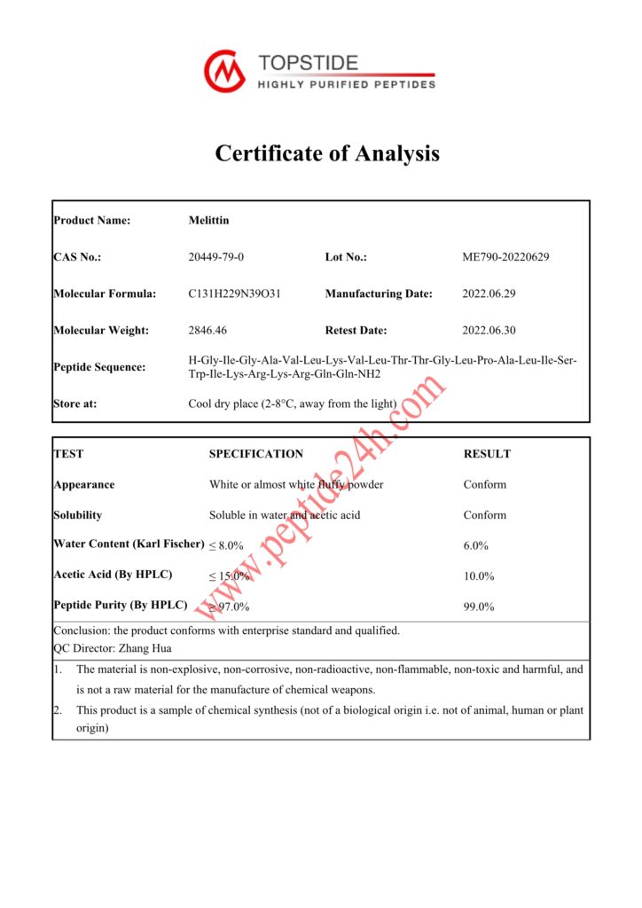 Name: Melittin; Forapine; Honeybee melittin; Bee venom melittin