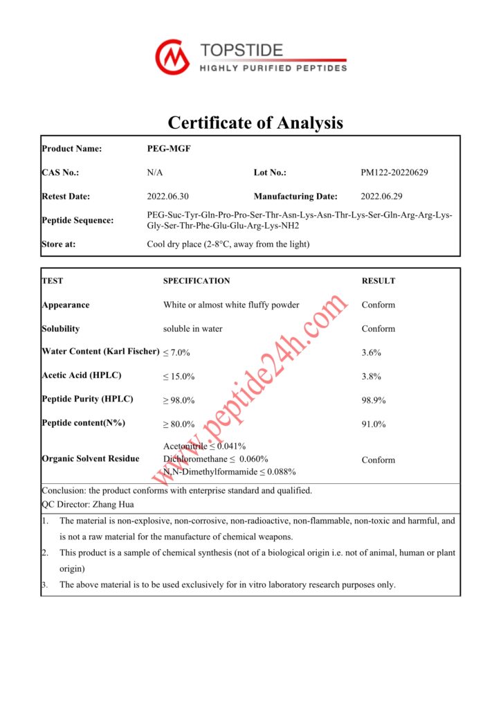 PEGylated Mechano-Growth Factor is a modified form of MGF, itself a modified form of IGF-1. Research has shown it to lower cholesterol and total body fat, boost immune function, and improve rates of wound healing.